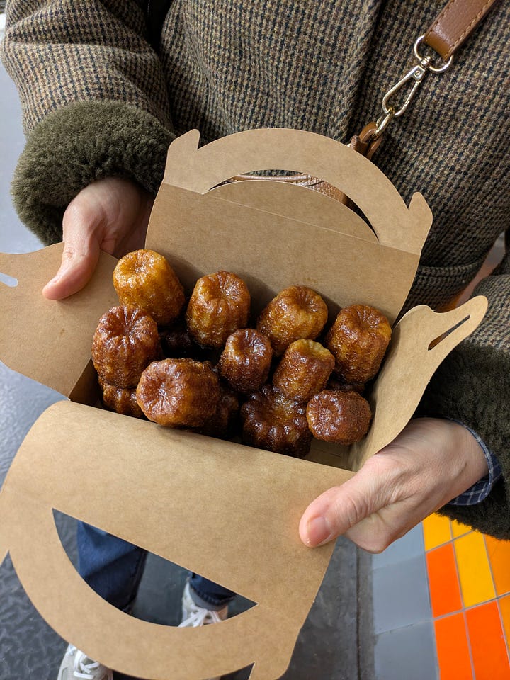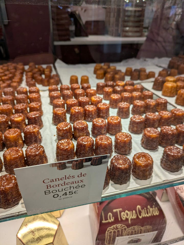 Before even leaving the station, we made our traditional first stop: La Toque Cuivrée, for cannelés. If you’re unfamiliar, cannelés are small caramelized pastries from Bordeaux: crispy outside, custardy inside, scented with vanilla and rum. This chain began in Bordeaux and expanded across France, and their pastries are incredibly affordable compared to most Parisian bakeries.